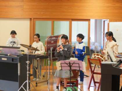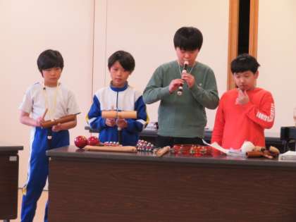4年生は、富山県南砺市五箇山地方に伝わる民謡、こきりこ節を、季節ごとにアレンジし、「こきりこの四季」と題して演奏しました。