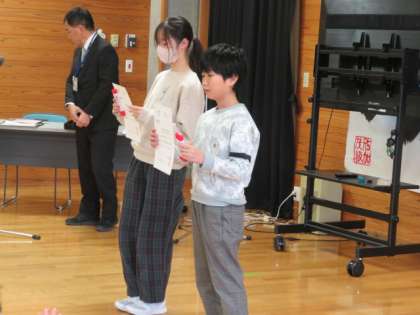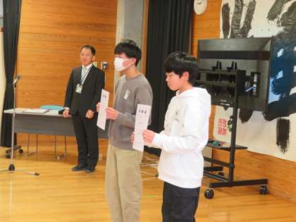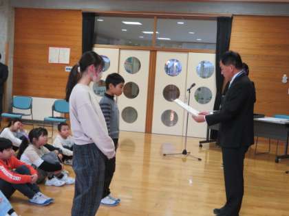 「防火ポスター」「マシンローイング大会」「絵で伝えよう!わたしの町のたからもの」の受賞者を紹介し、校長から賞状をもらいました。一人一人のがんばりが認められる喜びだけではなく、受賞した子供たちを賞賛する子供たちの素敵さを感じました。