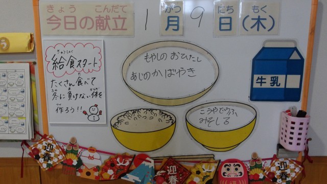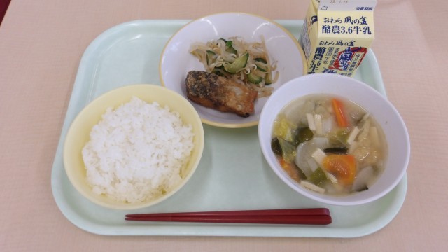 今日の献立は、ごはん、牛乳、もやしのおひたし、アジの蒲焼き、高野豆腐の味噌汁です。