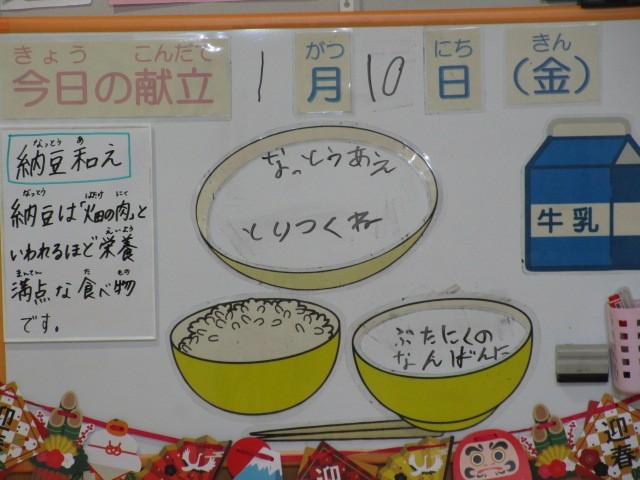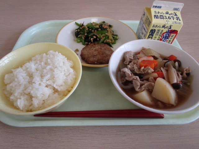 今日の献立は、ごはん、牛乳、鶏つくね、納豆和え、豚肉の南蛮煮です。