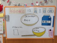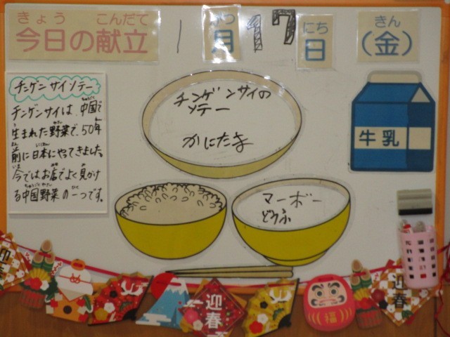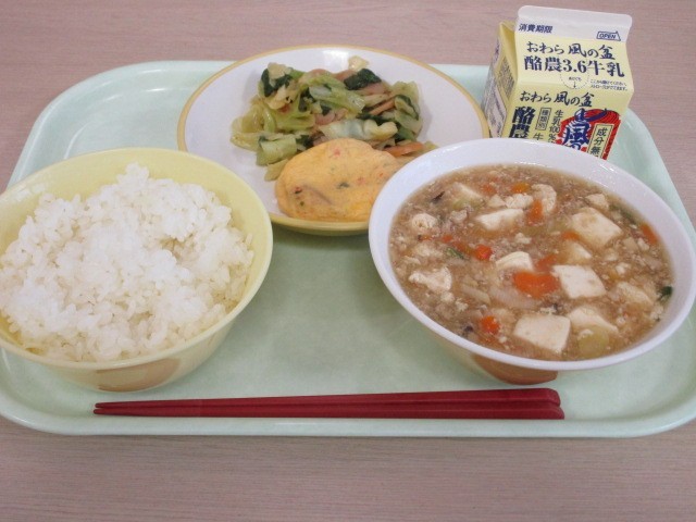 今日の献立は、ごはん、牛乳、かにたま、チンゲンサイソテー、マーボー豆腐です。