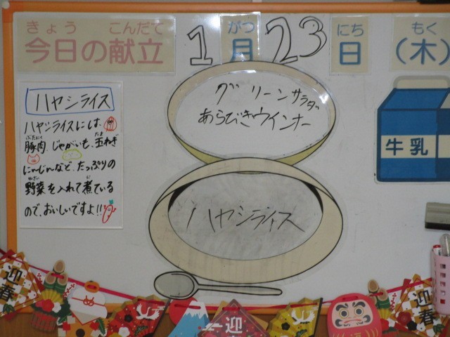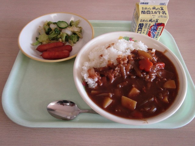 今日の献立は、ハヤシライス、牛乳、あらびきウインナー、グリーンサラダです。
