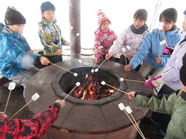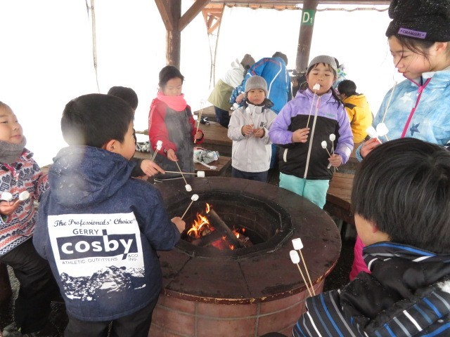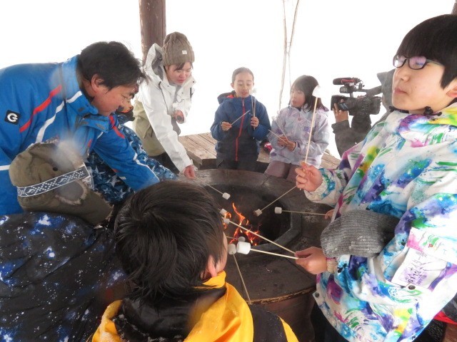天湖森スタッフの皆さんのご厚意で、焼きマシュマロをいただきました。冷えた体に、焼きマシュマロが染み渡ります。たき火でマシュマロを焼いて食べました。