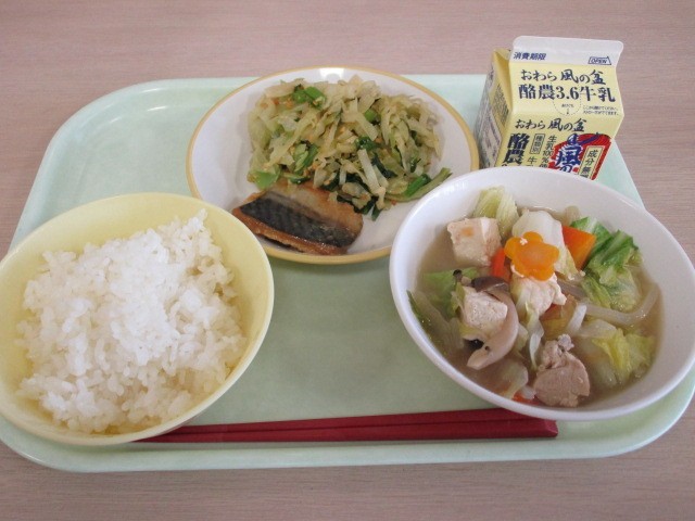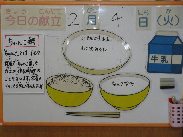 今日の献立は、ごはん、牛乳、さばのみそ煮、いり大豆和え、ちゃんこ鍋です。