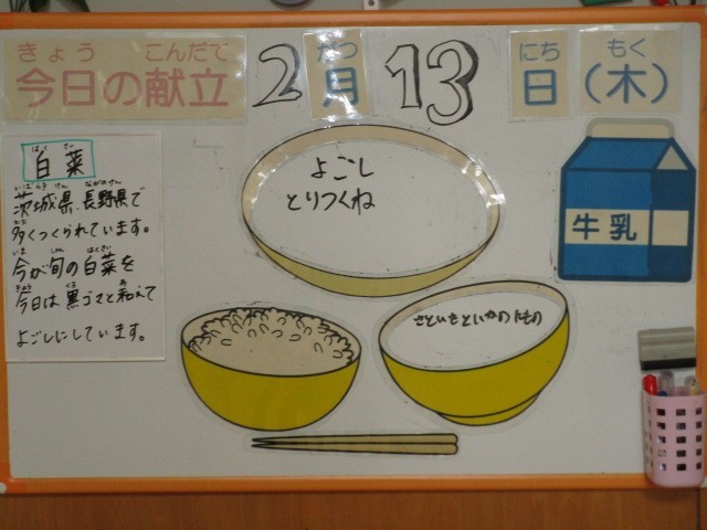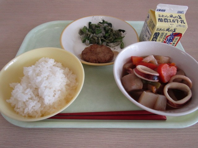 今日の献立は、ごはん、鶏つくね、よごし、里芋といかの煮物です。