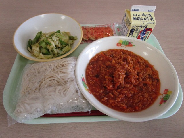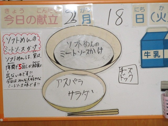 今日の献立は、牛乳、ソフト麺のミートソースかけ、チーズドッグ、アスパラサラダです。