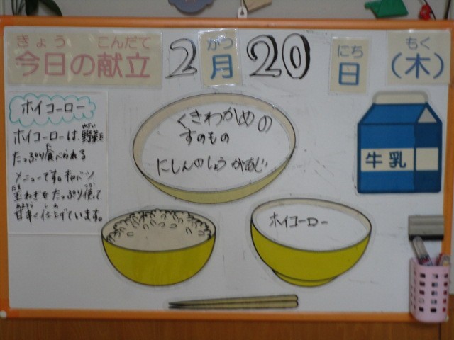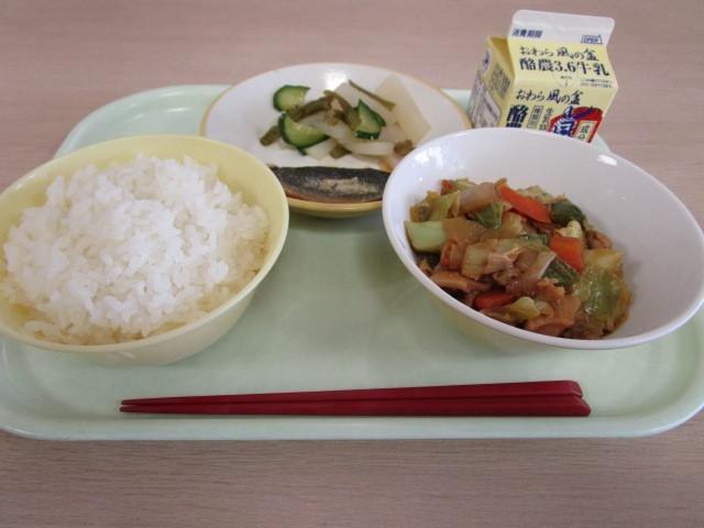 今日の献立は、ごはん、牛乳、にしんの生姜味、茎わかめの酢の物、回鍋肉です。