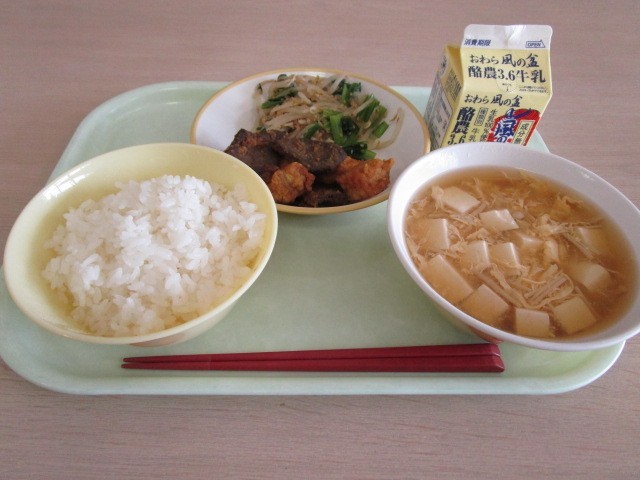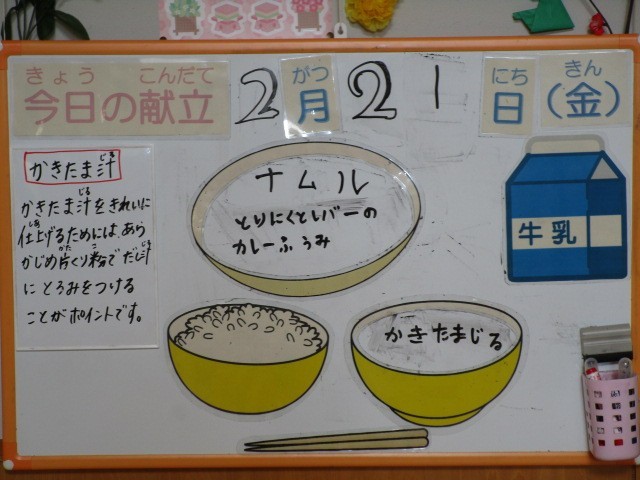 今日の献立は、ごはん、牛乳、鶏肉とレバーのカレー風味、ナムル、かきたま汁です。