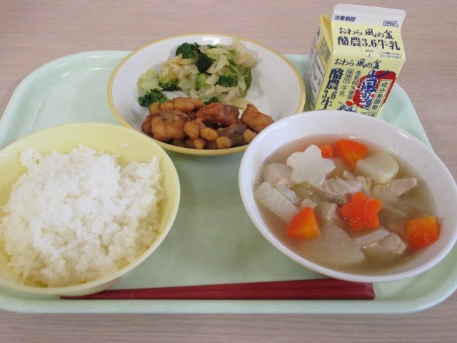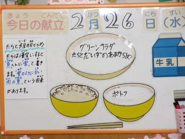 今日の献立は、ごはん、牛乳、たらと大豆の甘からめ、グリーンサラダ、ポトフです。