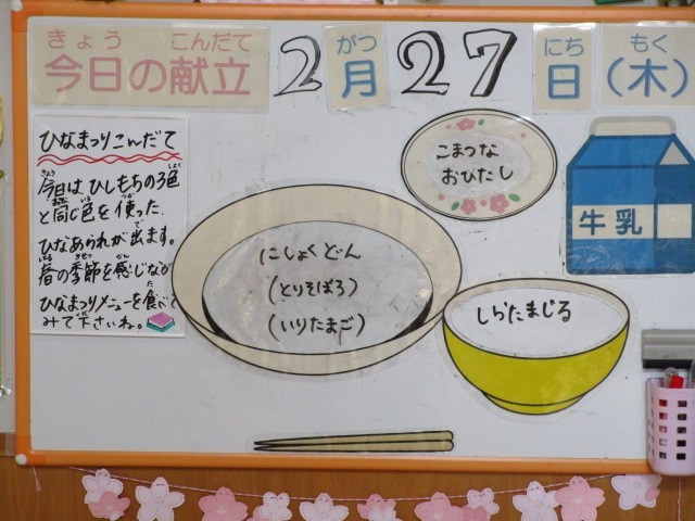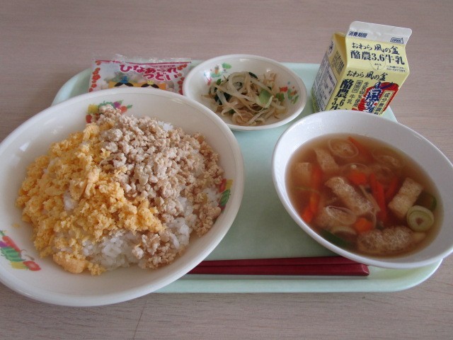 今日の献立は、ごはん、牛乳、二色丼(鶏そぼろ、炒り卵)、小松菜おひたし(なばなひたしから変更)、白玉汁、ひなあられです。