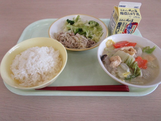 今日の献立は、ごはん(有機米)、牛乳、豚肉の塩こうじ炒め、、そえ野菜、ごま豆乳鍋です。