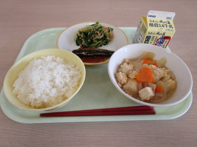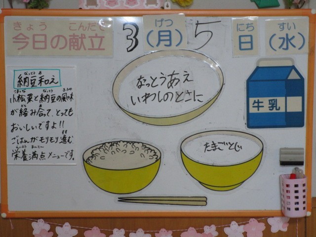 今日の献立は、ごはん、牛乳、いわしの土佐煮、納豆和え、卵とじです。