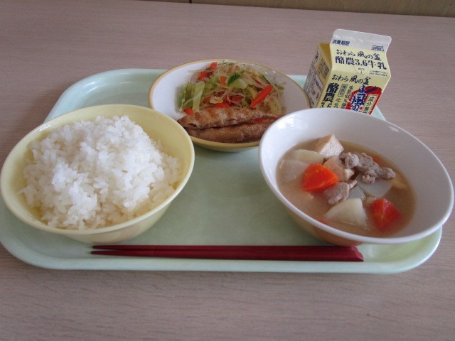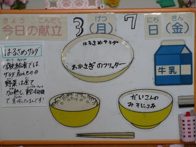 今日の献立は、ごはん、牛乳、わかさぎのフリッター、はるさめサラダ、大根のみそ煮込みです。