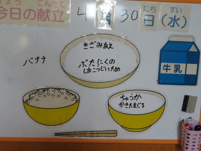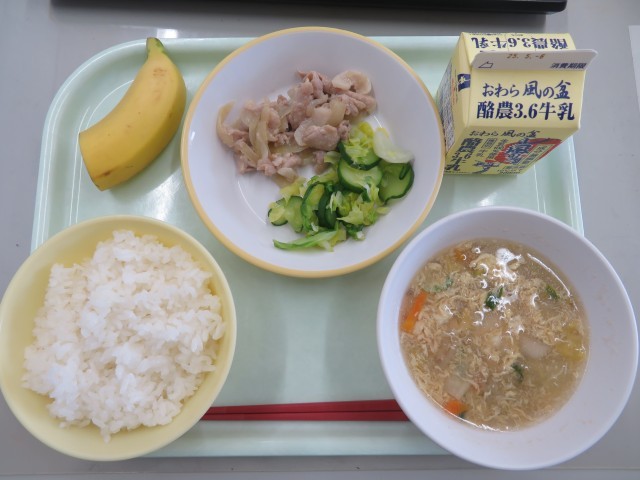 今日の献立は、ご飯、豚肉の塩こうじ炒め、きざみ合え、中華かきたま汁、バナナ、牛乳です。