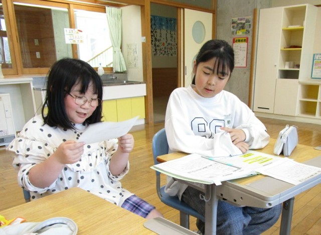 今年度、お昼の放送は各学年が順に行います。今週は、4年生が担当します。ペアになる2人でお互いの言葉を聞き合いました。全校のみんなに伝わる放送になるよう、アドバイスし合って練習しました。