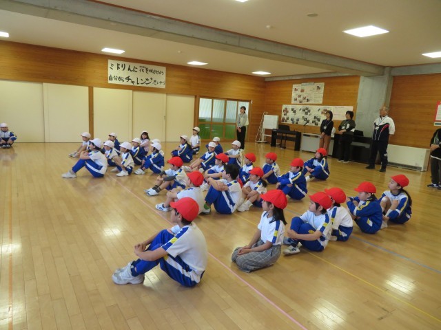 今日の朝のつどいは、縦割り班顔合わせと小学校の結団式を行いました。