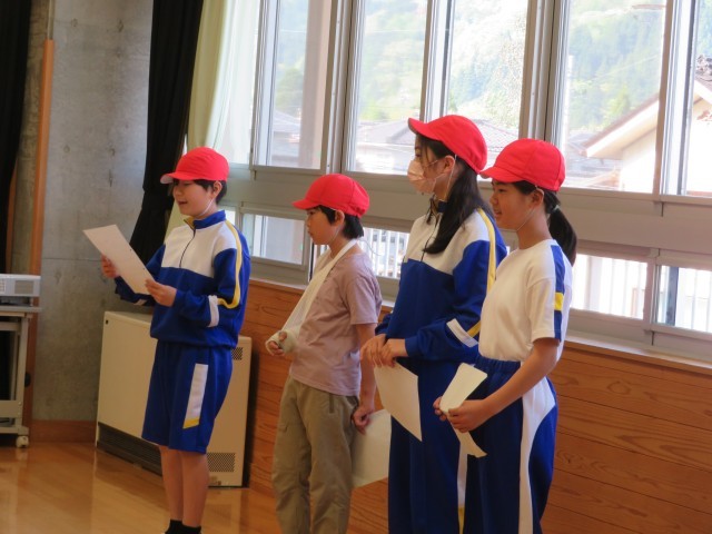 赤団の団役員が一人ずつ、言葉を述べます。団長、副団長、旗手、太鼓の子供たちです。