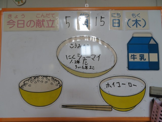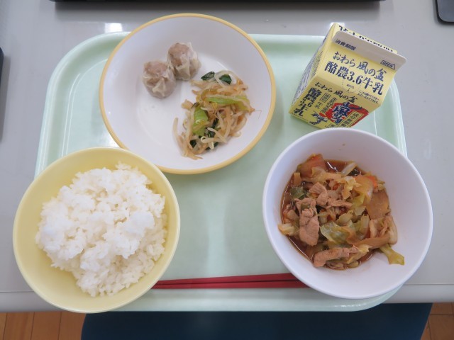 今日の献立は、ご飯、牛乳、肉シュウマイ、香味合え、回鍋肉です。