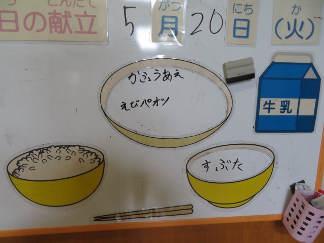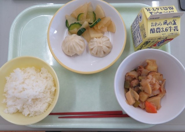 今日の献立は、ご飯、牛乳、えび包子、華風合え、酢豚です。
