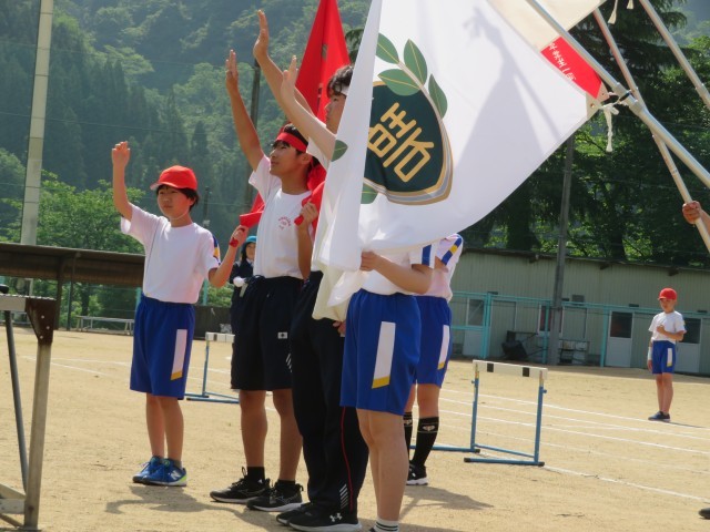 開会宣言、国旗掲揚、選手宣誓を終えると、今年度は、小中合同エール交換が新しく加わり、お互いの団にエールを送りました。