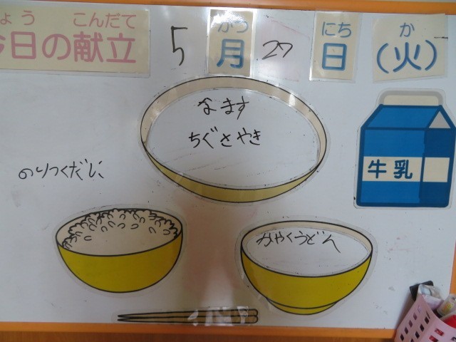 今日の献立は、ご飯、牛乳、千草焼き、なます、かやくうどん、のり佃煮です。