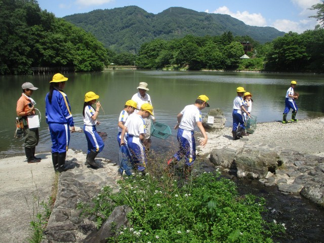 4~6年生の宿泊学習1日目、最初の活動は天湖森の生き物調査でした。自然博物園ねいの里の職員の方から説明をよく聞き、魚や野ネズミの捕獲調査の準備を行いました。魚の罠を設置する際には、餌の匂いと水流の流れの関係に着目し、友達と協力しながら設置する姿が見られました。