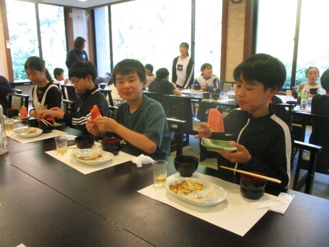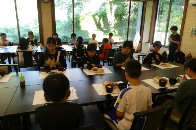 生き物調査を終えた後は、バスで楽今日館に向かいました。大浴場で入浴を済ませた後、夕食の時間となりました。今日のメニューはハンバーグ定食。みんなで1日の活動を振り返りながら、味わっていただきました。