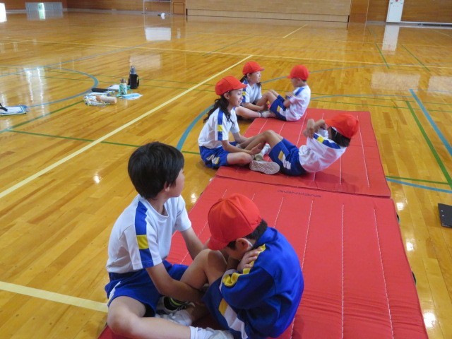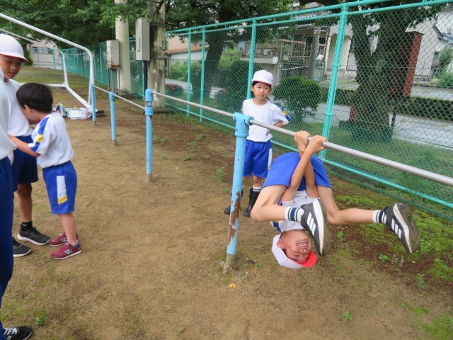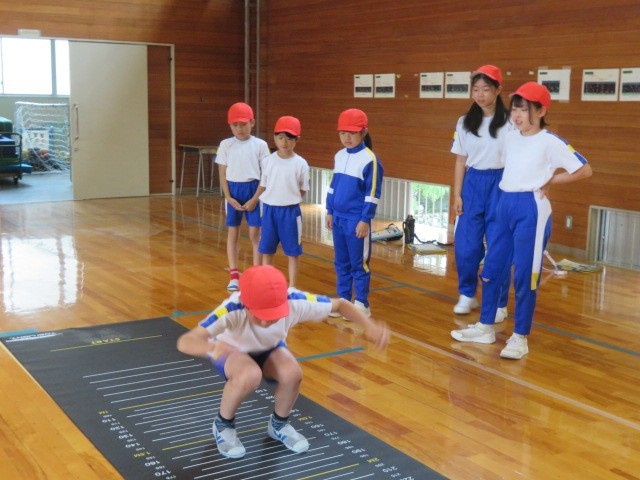 行った種目は、上体起こし、反復横跳び、立ち幅跳び、ソフトボール投げ、鉄棒運動の5種目です。あいにくの天気で途中中断することもありましたが、子供たちは自分の目標をもって、記録を伸ばそうとがんばっていました。