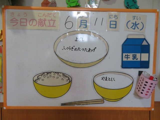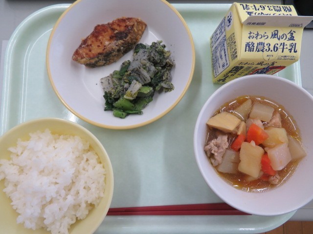 今日ごしの献立は、ご飯、牛乳、ふくらぎの竜田揚げ、よごし、大和煮です。