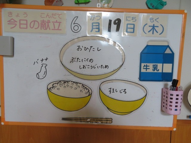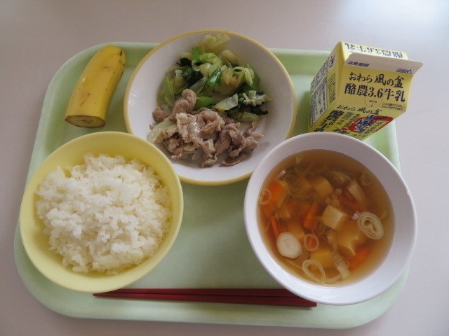 今日の献立は、ご飯、牛乳、豚肉の塩こうじ炒め、おひたし、すまし汁、バナナです。