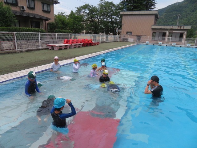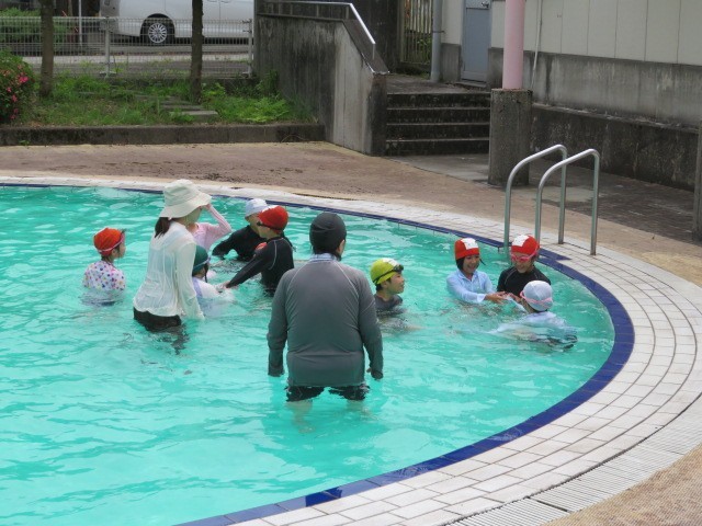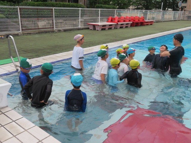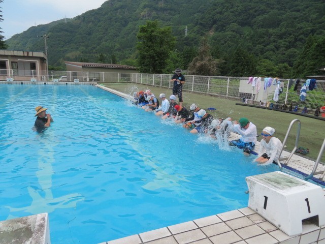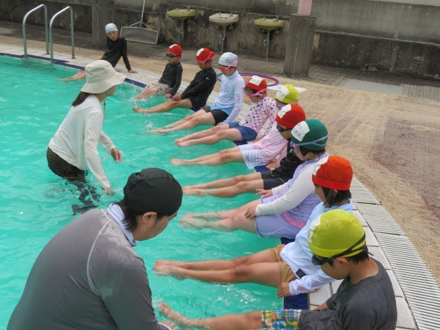 気温が高く、絶好の水泳学習日和です。碧っ子は泳力別の3グループに分かれ、今日はそれぞれ水に慣れる時間になりました。