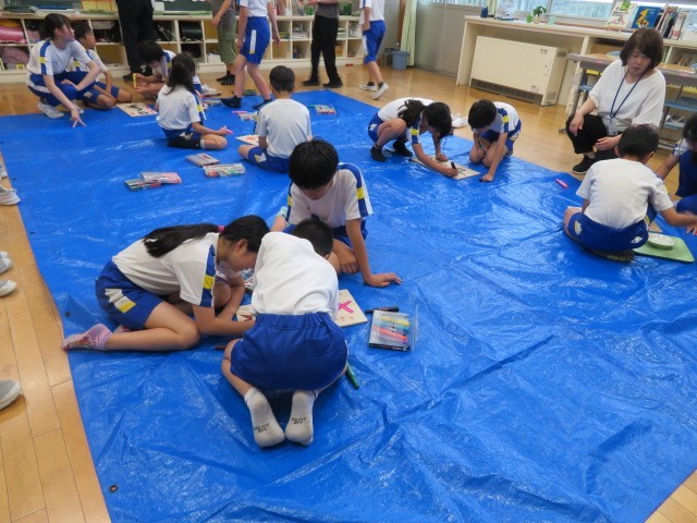 6月20日に縦割り班でかいた、桜の看板を、5・6年生が仕上げをしました。