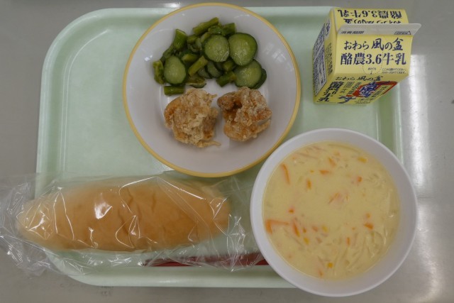 今日の献立は、コッペパン、牛乳、フライドチキン、アスパラサラダ、コーンポタージュです。