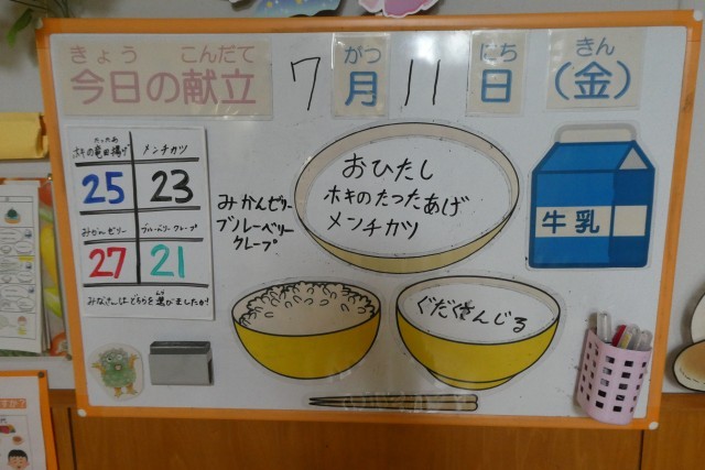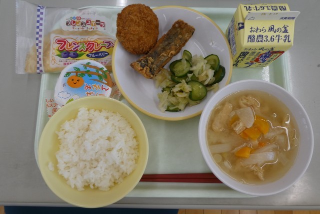 今日の献立は、ごはん、牛乳、ホキの竜田揚げまたはメンチカツ、おひたし、具だくさん汁、みかんゼリーまたはブルーベリークレープです。