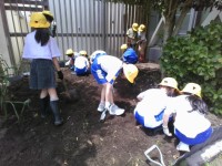 お昼は広場で碧っ子、船峅っ子が一緒になってお弁当を食べました。照れながら話しか...