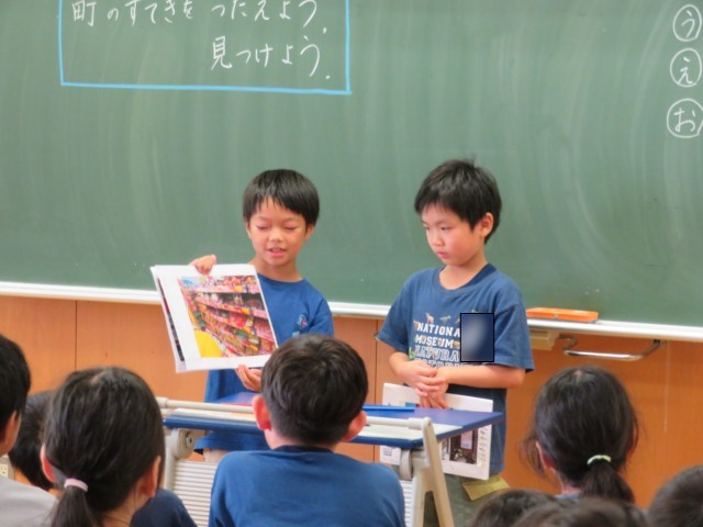 町探検で見付けた「町のすてき」の発表をしました。1回目は、青・紫・赤コースでした。