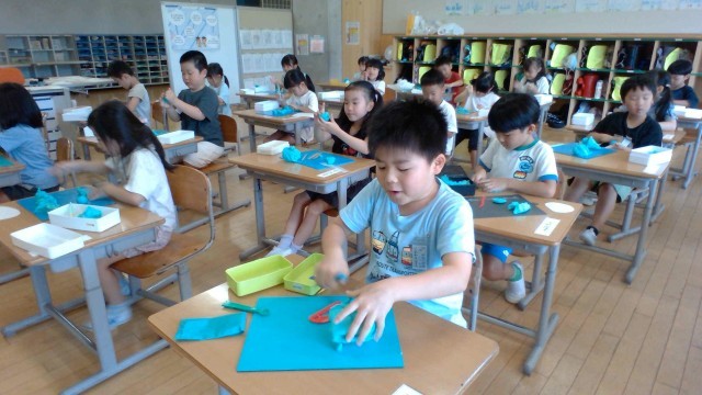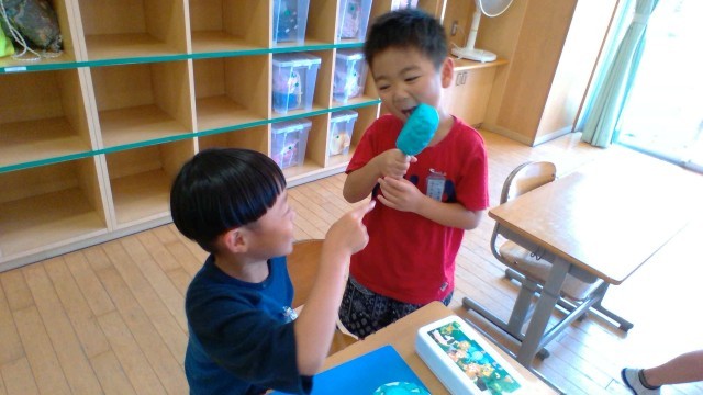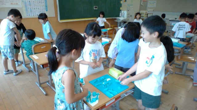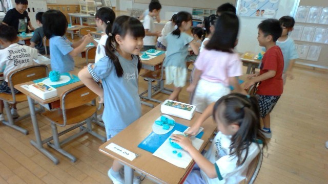 図工の時間に、粘土で「お店屋さん」を開きました。「どんなお店ならお友達に楽しんでもらえるかな?」と考えながら、工夫いっぱいのお店をつくりました。中には、夏休みの思い出を題材にしたお店もあり、一人ひとりの発想が光る素敵な作品となりました。