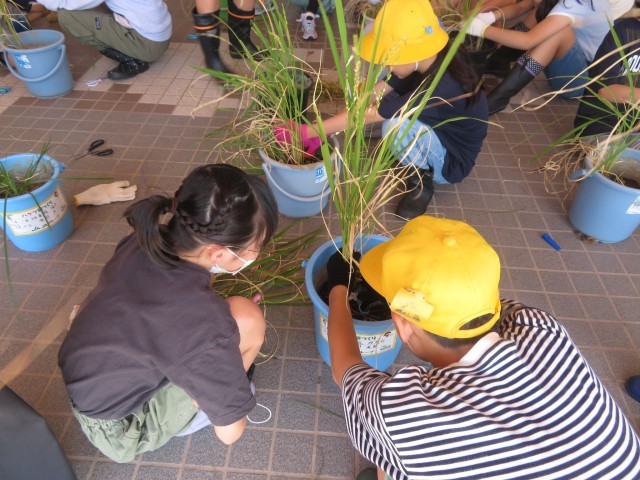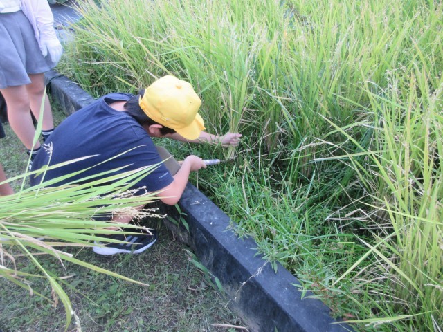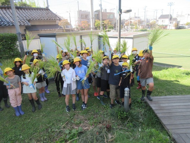 5年生は、5月から大切に育てた稲の収穫を行いました。はさみや鎌を使い、根元から上手に刈り取ることができました。稲を干した後は、脱穀です。美味しいお米が食べられるのが楽しみですね。