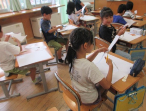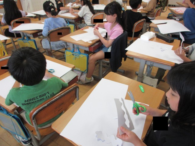 図工の時間では、「はさみのあーと」の学習が始まりました。この日は、思い思いにはさみの動きを楽しみながら、自由に紙を切ってみました。