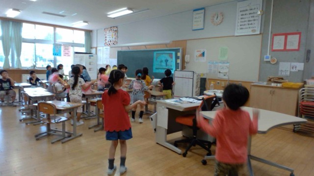 学習発表会の練習を頑張っている1年生。休み時間に、進んでダンス練習をしていました。