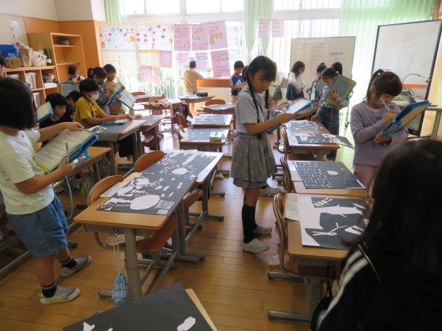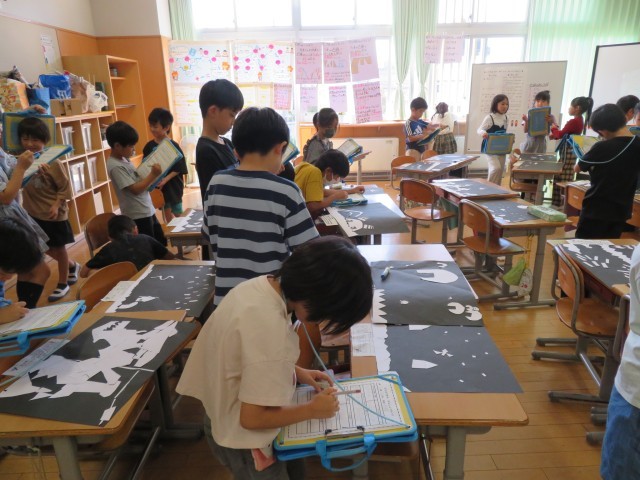 白画用紙を切り、それを黒画用紙に貼り付けてできる作品ですが、一人一人違っていて、その面白さを見付けたり、イメージを共有したりしました。鑑賞カードを熱心に書き進めていました。