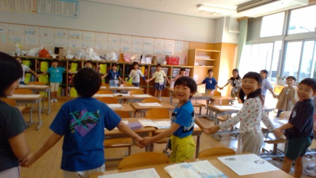 国語「くじらぐも」の学習で、お話に出てくる子供たちのように、みんなで輪になって、「天までとどけ、1、2、3!」と言いながらジャンプしました。「みんなで声をそろえると楽しいね」「ほんとに空までジャンプできそう」と話すなど、お話に出てくる子供たちになりきって音読を楽しむことができました。