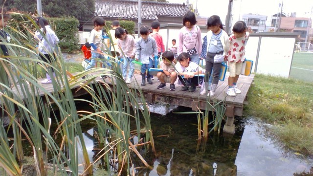 生活科の学習で、秋の虫を探しに行きました。ビオトープの中や草むらの中を探して、いろいろな虫を見つけることができました。
