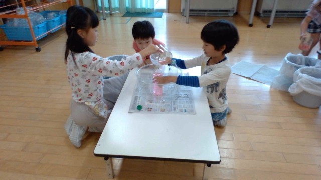 算数科「どちらがおおい」の学習で、ペットボトルに入った水の量を比べました。グループの友達と協力して、どのように比べるのか作戦を考えることができました。