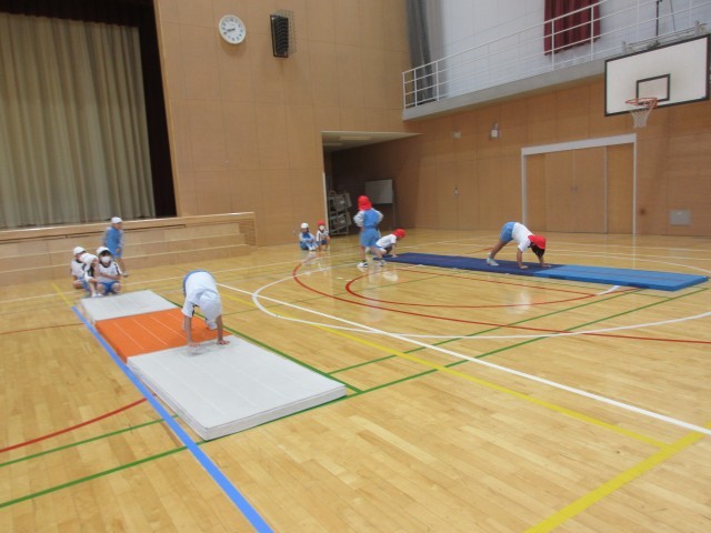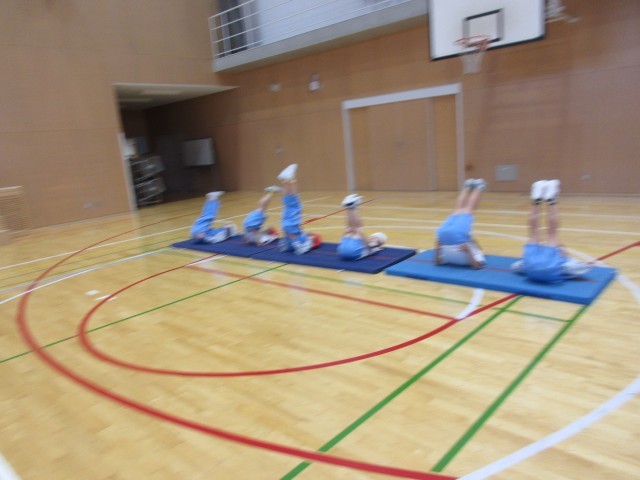 体育の時間にマット運動をしています。動物歩きや、背中倒立をして、マット運動に大切な動きを練習しました。