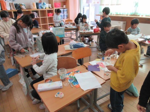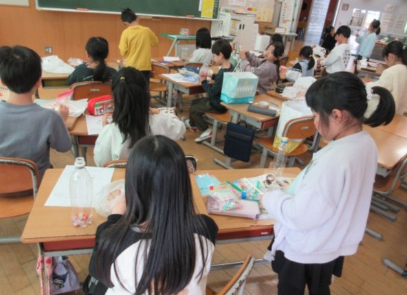 図画工作科「音づくりフレンズ」の学習では、材料をたたいたり振ったりして、お気に入りの音を見つけました。そして、音に合う形や色を考えて、作品をつくりました。鳴らし方を工夫していろいろな音を見つけ、音を楽しみながらつくっていました。