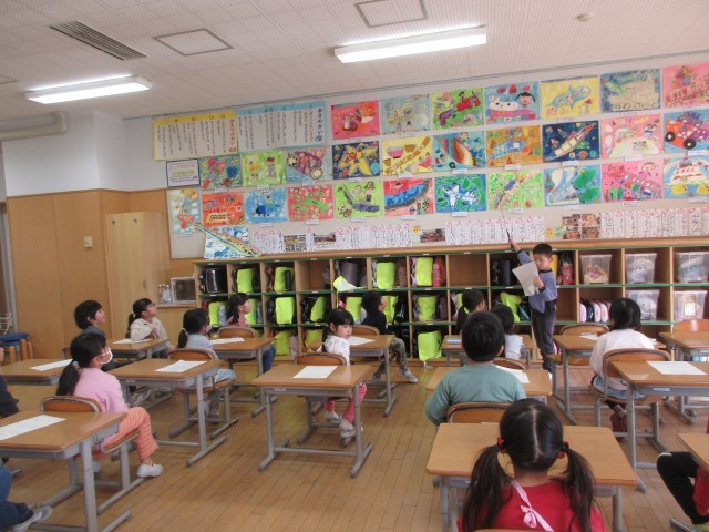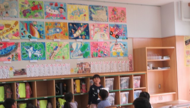 「のってみたいな、いきたいな」というテーマで、自分が乗ってみたい乗り物を考えて、絵に表しました。丁寧に時間をかけて描いた絵が仕上がったので、友達と見合いっこをしました。自分の絵のいいところを友達に見付けてもらって、子供たちはとても嬉しそうでした。