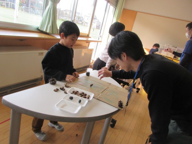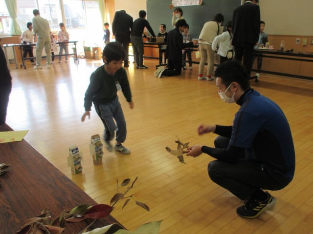 生活科の学習で「わくわく秋ランド」をつくってきた子供たち。最後に、学校の先生方を招待して遊んでもらいました。たくさんの先生方に楽しんでもらえて、子供たちはとっても嬉しそうでした。
