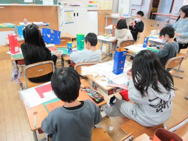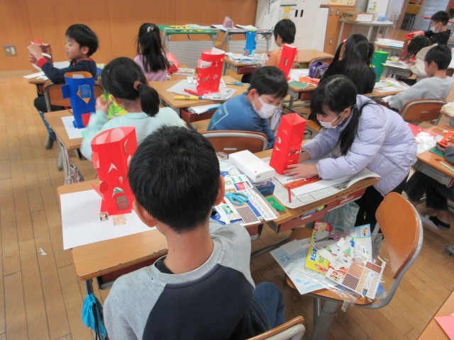 図画工作科「まどをあけたら」では、初めてカッターを使って学習しました。カッターの使い方を知り、切る練習をするところから始めました。子供たちは慎重にカッターを使いながら、いろいろな形の窓を切って作りました。そして、窓の中にはどんな世界が広がっているか想像しながら、作品を仕上げました。