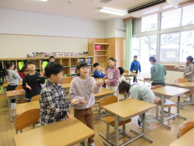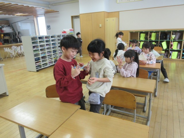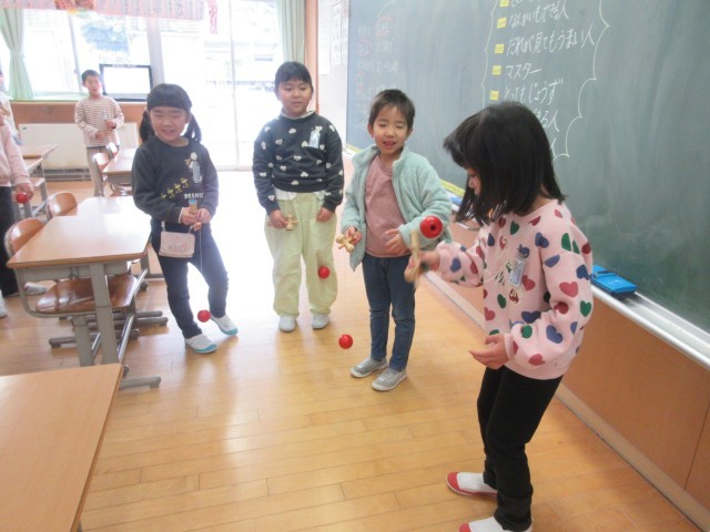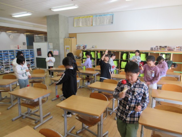 生活科「むかしあそび」の学習では、けん玉やあやとりなどに挑戦し、工夫しながら楽しく遊びました。